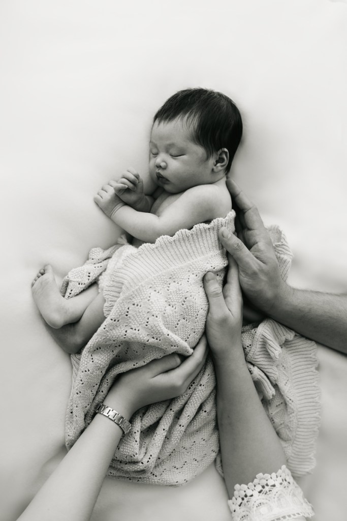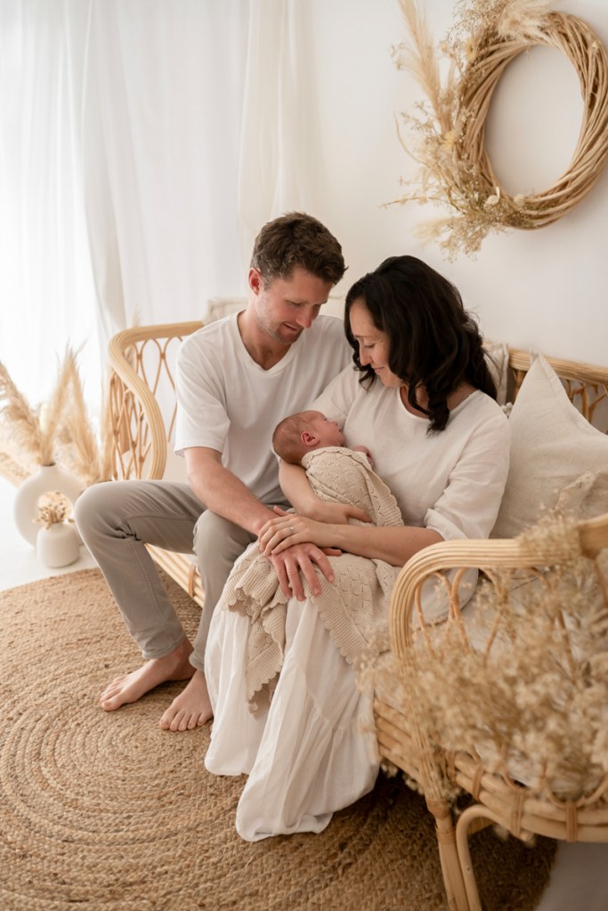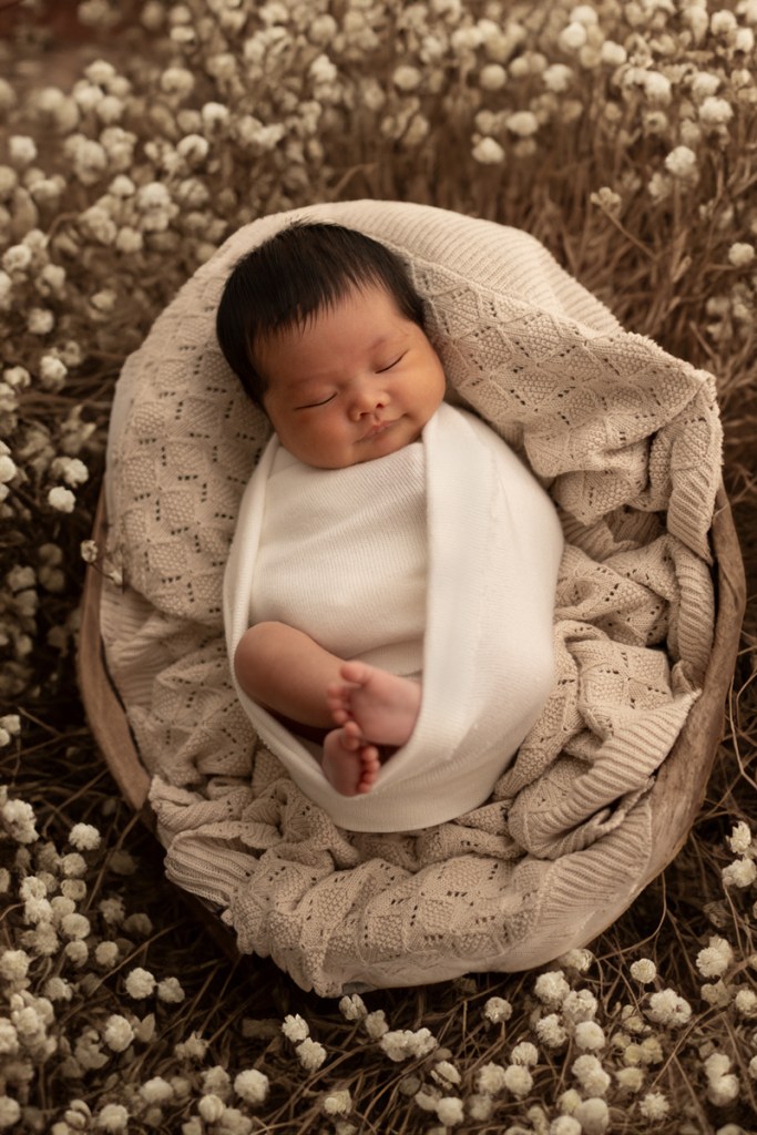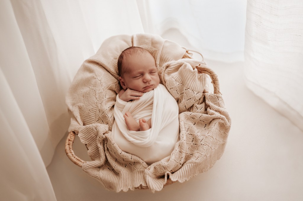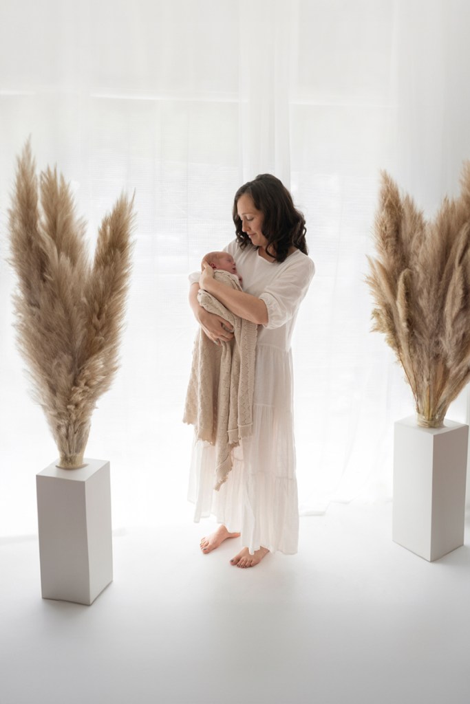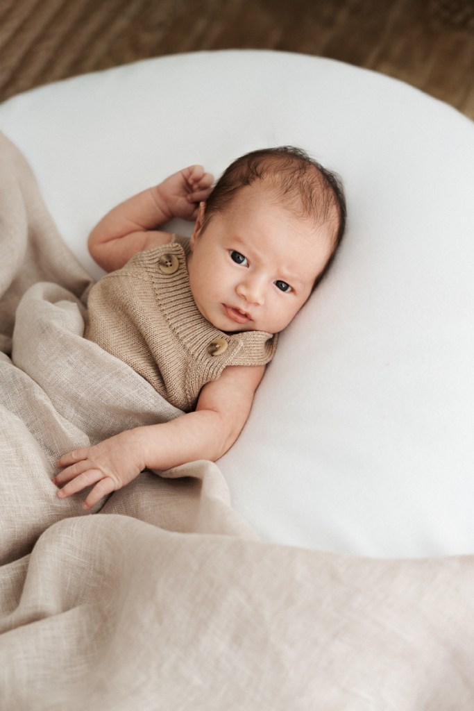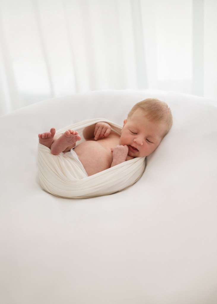 Modern and naturally styled photos of baby wrapped and posed in studio. These are done in a lightly posed style that looks natural. Natural fabrics are used to enhance photos, including 100% Linen, Cotton, Wools, natural florals and earthy pieces are the only props that will be included if requested. Newborn outfits and women’s wardrobe inclusive. Parent and Sibling photos with baby included.